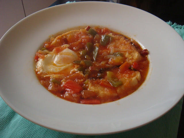 Se fríe la cebolla, el pimiento y el tomate. Tomate se echa más cantidad. Luego se le echa el agua, con una hoja de laurel, después se le machaca una mijina de ajo, y cuando está hirviendo el caldo, se le echa el plato de pan picao. Se deja esponjar y a comer.